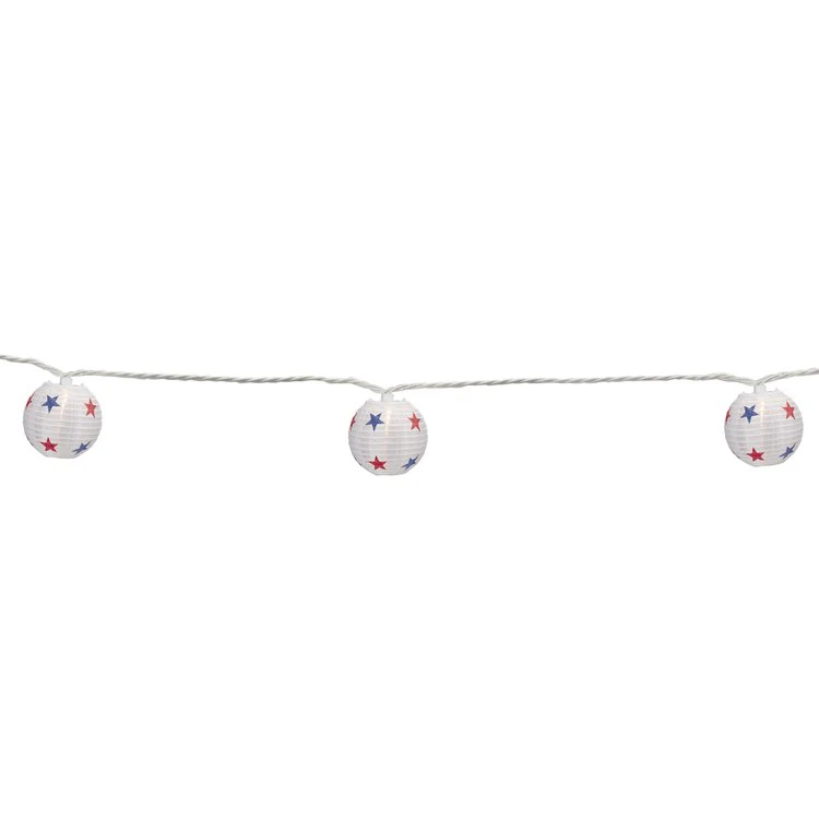 Illuminate your canopy patio indoor or any outdoor space with this strand of paper lantern lights. This strand of clear mini lights has a white paper lantern shade with red and blue star designs. These lights will be the perfect addition to your Memorial Day or Fourth of July celebration or simply a fun addition to your summer decor.